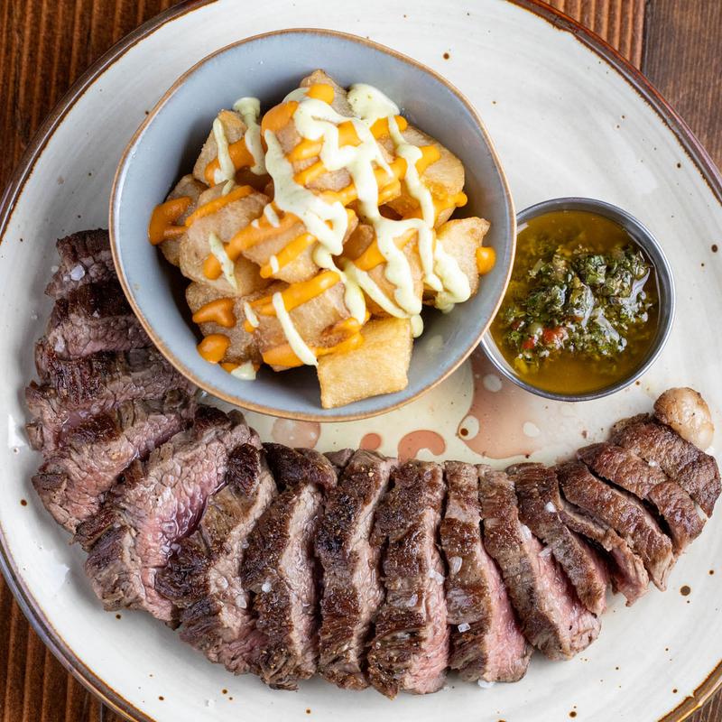 Seared steak, chimichurri sauce, papas bravas.